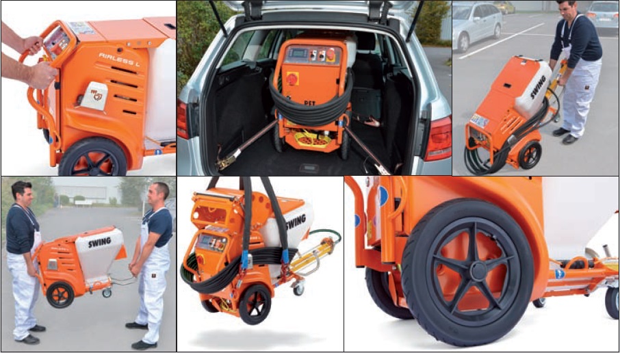 A nova PFT SWING Airless projeta quase todos as massas pastosas em paredes e tetos confortalvalmente.